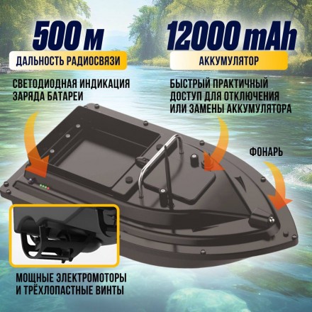 Катер оснащен мощным аккумулятором 5200 mAh, что позволяет ему быть на ходу до 4х часов, либо проплыть на расстояние до 2х км. Аккумулятор размещен в передней части корпуса корабля и имеет быстрый практичный доступ для отключения или замены. На корме судна есть светодиодная индикация заряда батареи. Дальность радиосвязи корабля составляет 500 м, благодаря этому вы сможете забросить снасти в любое место в водоеме! Скорость передвижения - до 6 км/ч. Мощные электромоторы и трёхлопастные винты делают катер очень маневренным, в следствие чего он может развернуться в радиусе 1 метр.